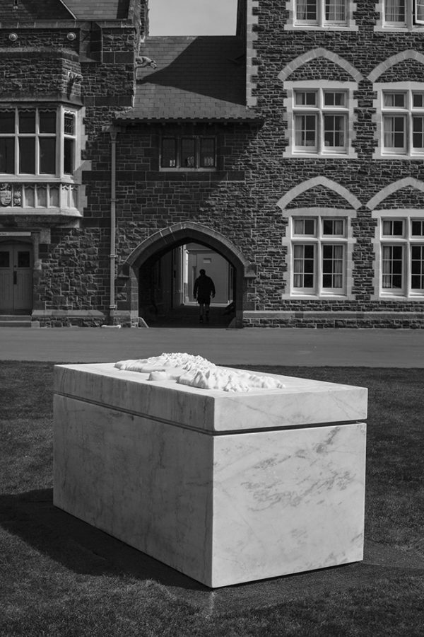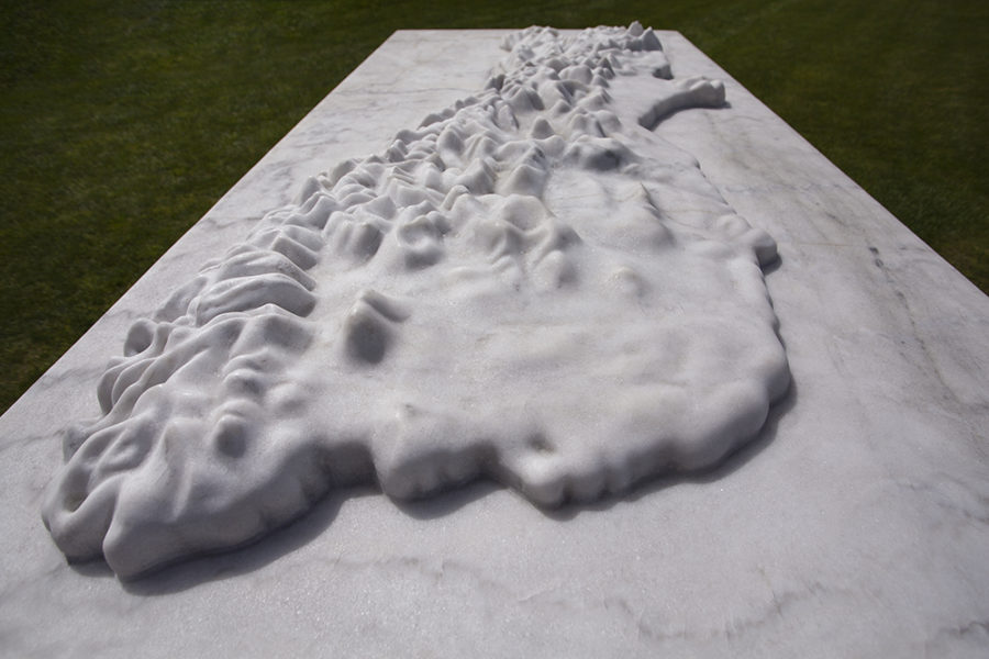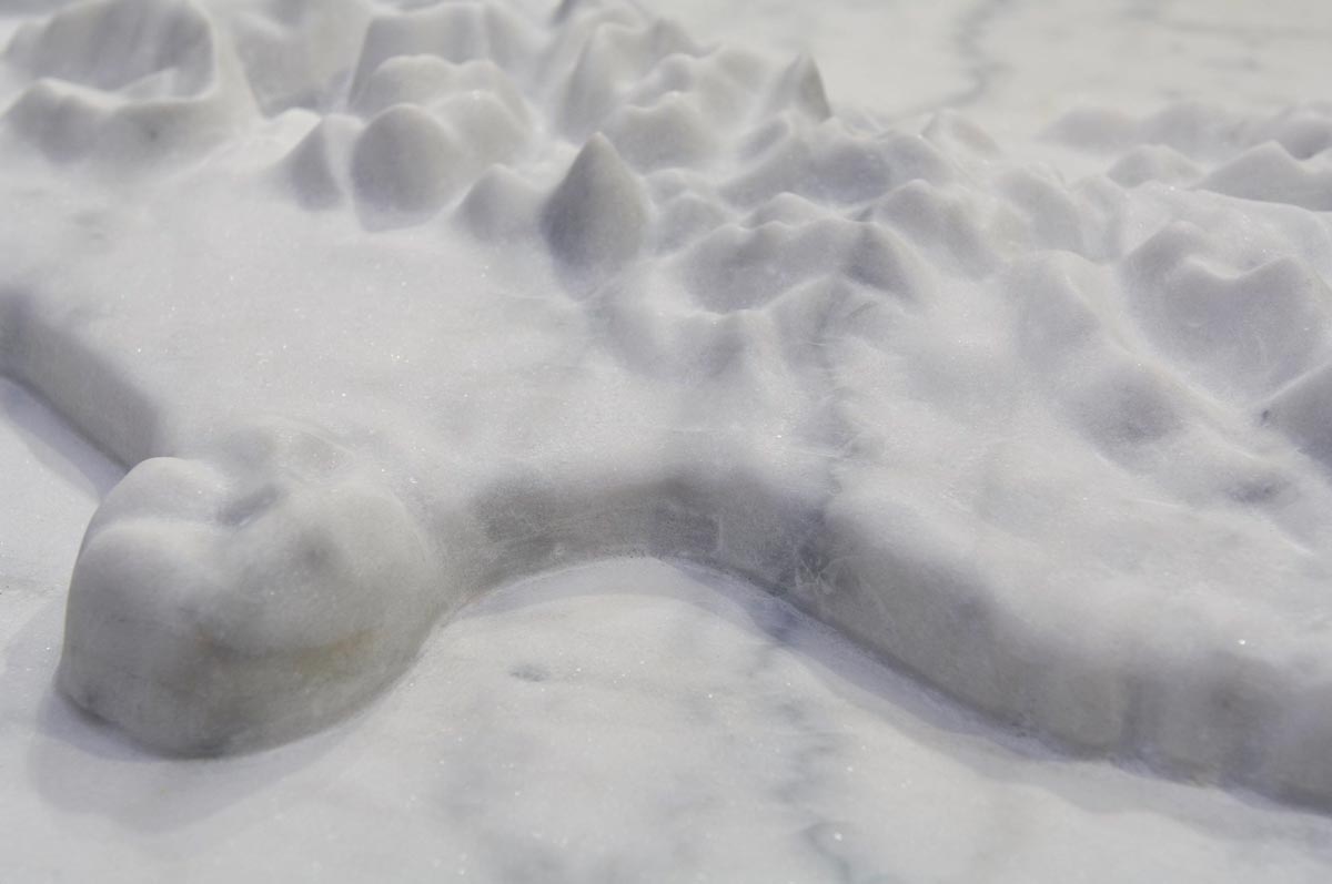 Plot invites us to consider how we think about and value land. Brett Graham (Ngāti Korokī Kahukura) was interested in how Te Waipounamu (the South Island) had been surveyed, divided up and then ‘purchased’ from Ngāi Tahu by the settler government. The carved marble topographic rendering of Te Waipounamu sits on a sarcophagus-like form, suggesting that the land endures a death when viewed only as a commodity.