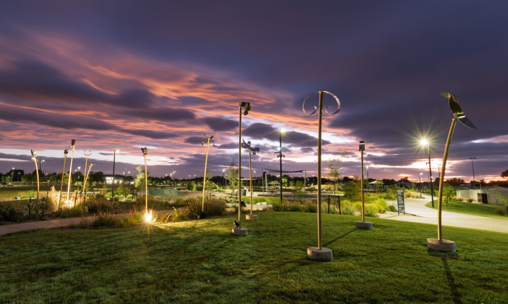 Dr Wilkinson’s distinctive, meaningful public artwork takes inspiration from ancestral rock art of Te Waipounamu. The work is comprised of twenty light-reflecting stainless-steel figures, mounted on tall, slender poles to vibrate with life, shimmering slightly in the air above people’s heads. The tallest poles are four metres high and the figures are arranged in groups throughout the reserve, leading people through the landscape and indicating areas of importance.