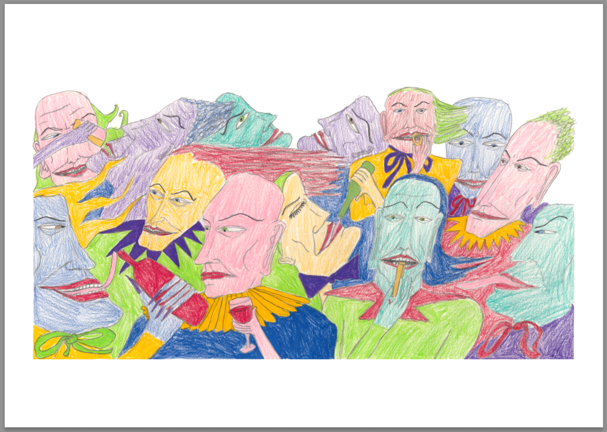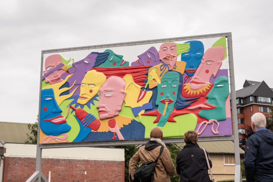 In this work the figures are drinking laughing and enjoying each other’s company in an imagined queer bar. There are no current permanent queer bars in Christchurch, this works acts as an acknowledgement of the queer community and the hard work they are putting in to create queer nights and spaces, whilst also proposing that we need a permanent venue. – Priscilla Rose Howe